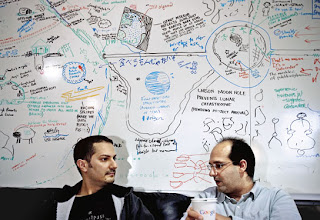 GOOGLE GRAFFITI Two employees break for coffee beside the “idea board,” a canvas for playfully grand designs like Google spaceships.