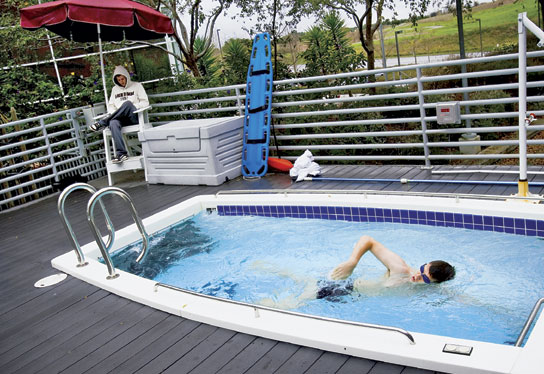 GOOGLER WITH GOGGLES A lifeguard sits on duty as an employee works out in one of two swim-in-place pools at Google’s headquarters.