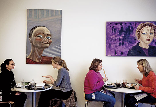 | MARCHING ON ITS STOMACH Google is obsessive about food, offering its employees three free gourmet meals a day that can be eaten in a cafeteria adorned by artwork created by Google employees. |